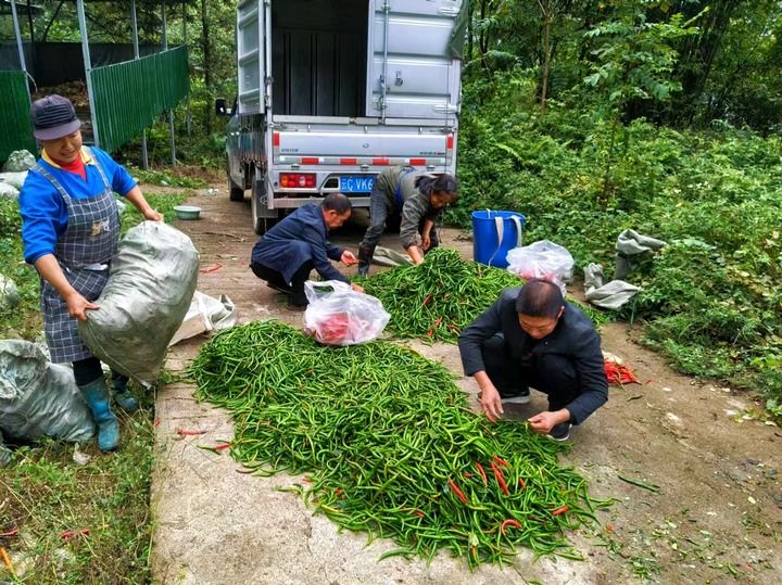 图为万古村村民正在整理收获的辣椒。