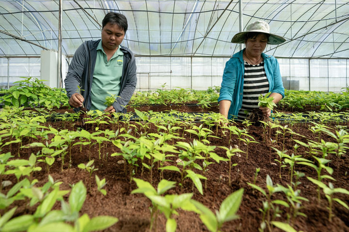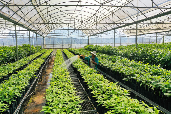 两名工作人员在普洱绿银生物股份有限公司的牛油果种苗基地打理种苗(10月28日摄)。新华社记者 陈欣波 摄