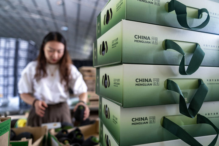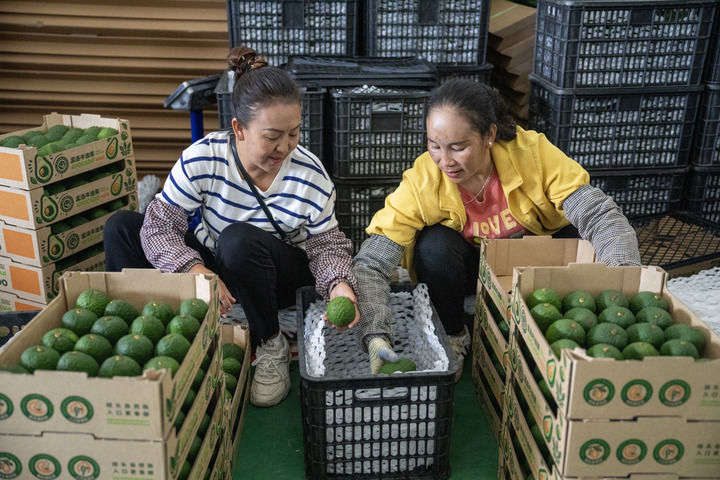 工人在中国孟连牛油果集配中心内包装分选后的牛油果(10月29日摄)。新华社记者 陈欣波 摄