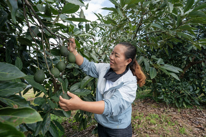 由企业在当地农民中培训的产业技术人员李美琼在一处牛油果种植基地检查待采的牛油果(10月29日摄)。新华社记者 陈欣波 摄