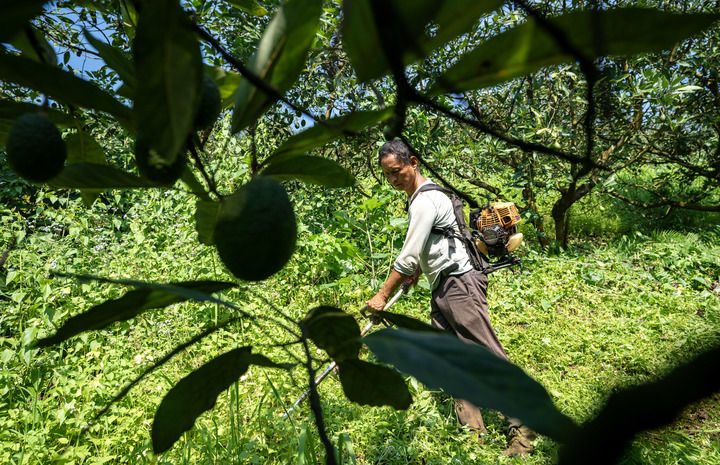 一名工人在普洱绿银生物股份有限公司的牛油果种植基地为牛油果树除草(10月28日摄)。新华社记者 陈欣波 摄