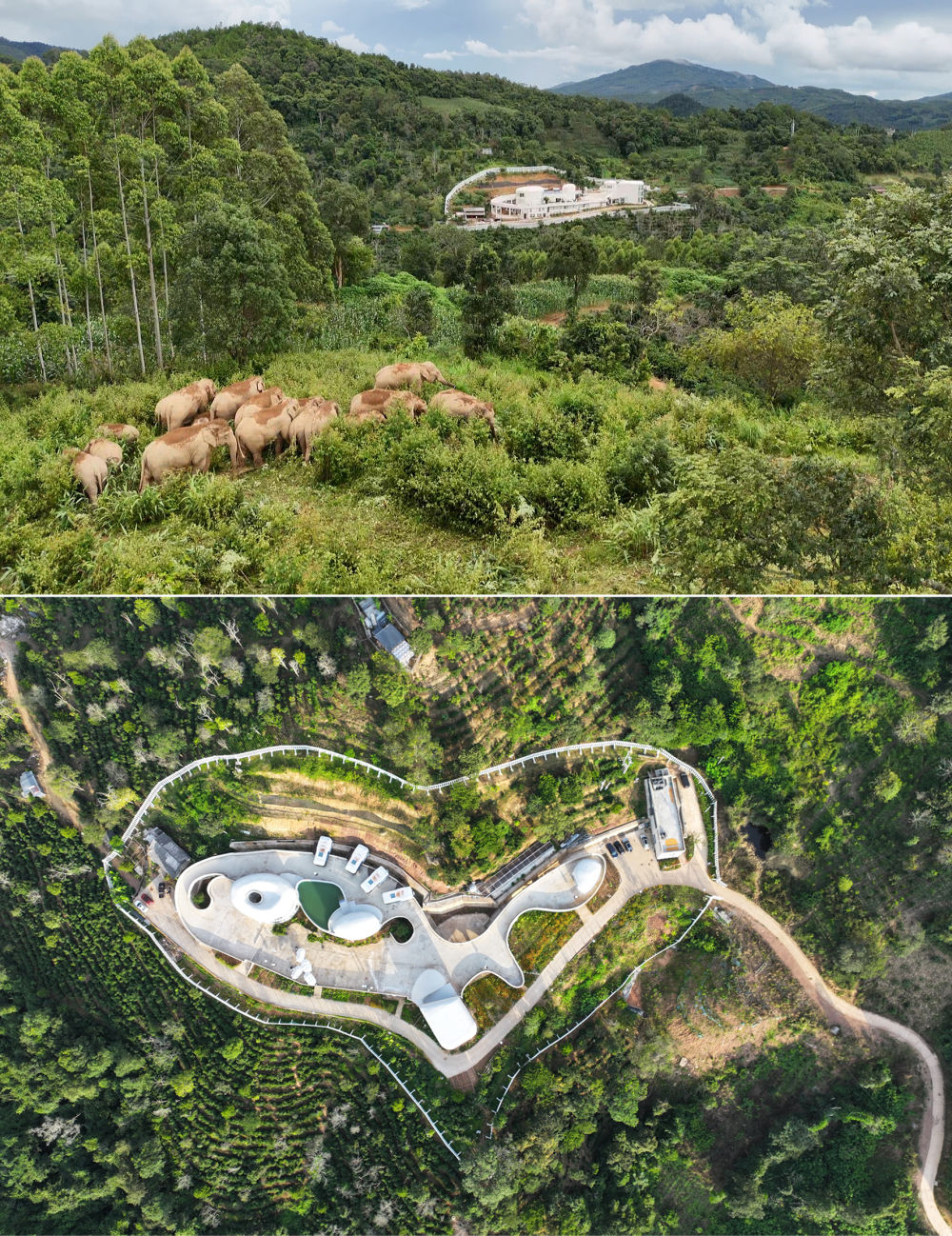 这是一张拼版照片,上图是在大象咖啡精品庄园附近拍摄的亚洲象群,下图是从空中俯瞰的大象咖啡精品庄园。(受访者供图)