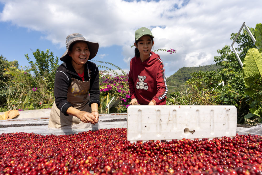 一名小朋友(右)在位于普洱市思茅区的天玉庄咖啡庄园体验翻晒咖啡果。新华社记者陈欣波 摄