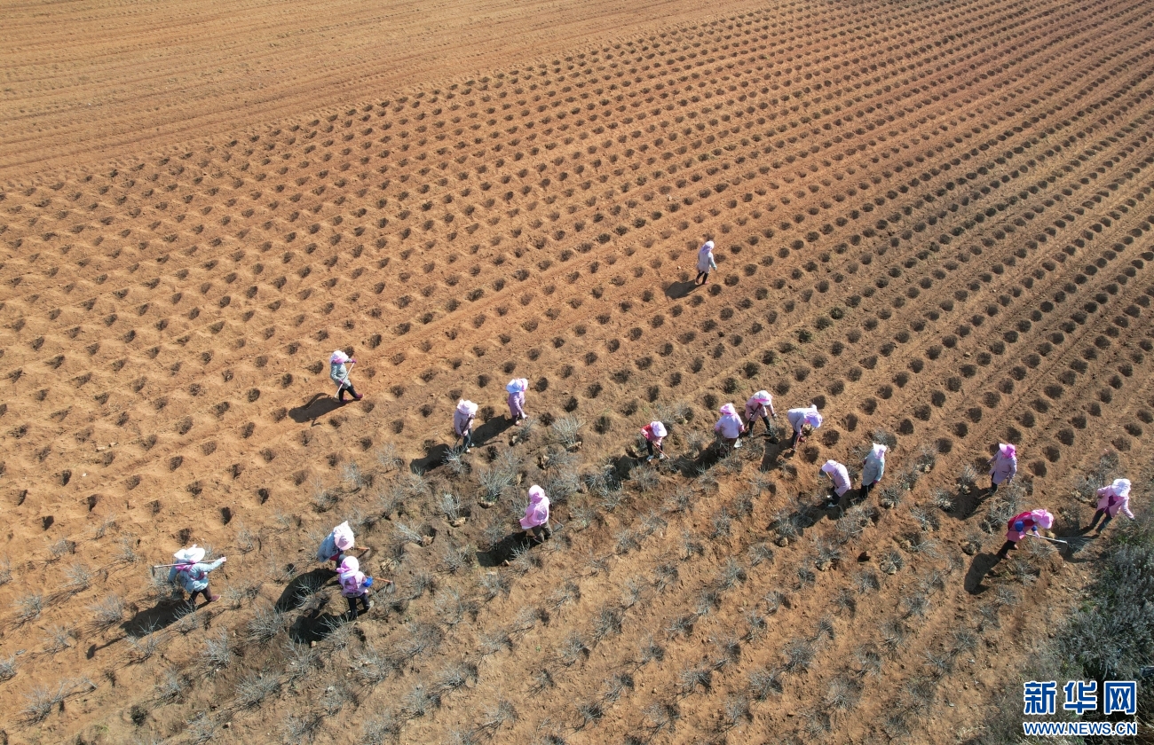 航拍视角下,务工人员正在花卉种植基地里劳作(1月4日摄)。新华网发(杨俊鹏 摄)