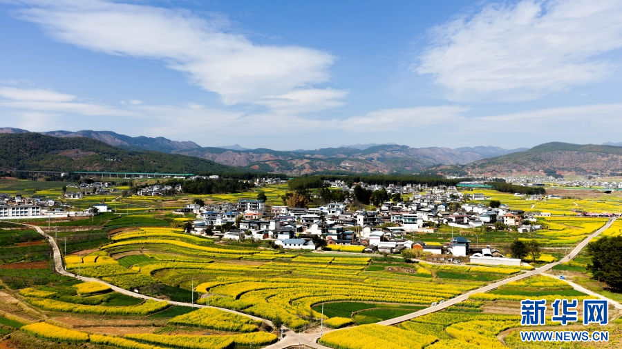 绵延的油菜花海与村庄、蓝天白云相互映衬(2月20日摄)。新华网发(黄申源 摄)