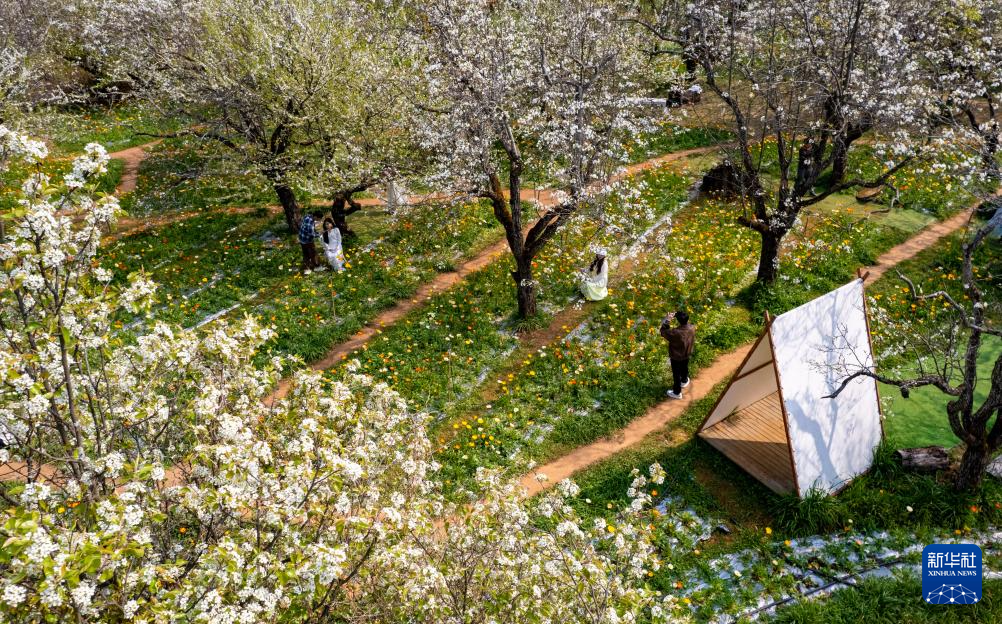 3月10日,游客在昆明名花谷游玩(无人机照片)。新华社记者 陈欣波 摄