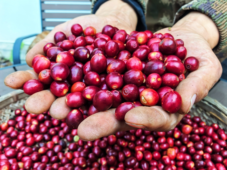 新鲜采摘的咖啡豆(摄于1月15日)。新华网 赵普凡 摄