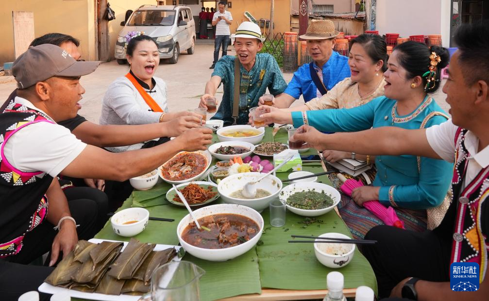 近日正值泼水节,“民族团结长桌宴”在云南省普洱市西盟佤族自治县的傣族村寨里举行。