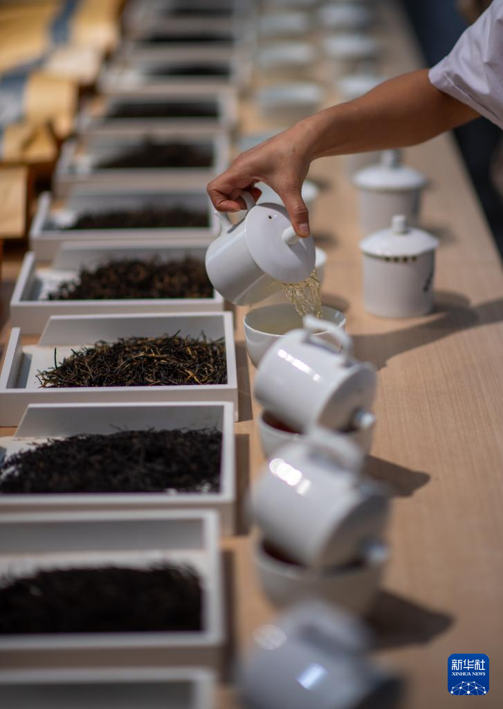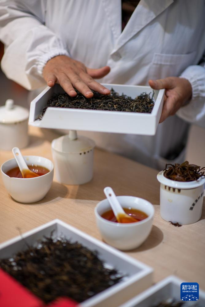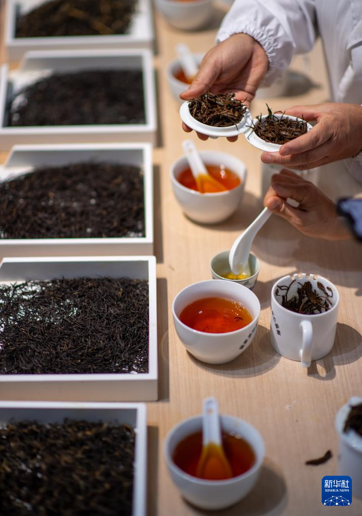 4月22日,云南省临沧市双江县茶叶检测品荐溯源中心的专家在评审茶叶。新华社记者 江文耀 摄