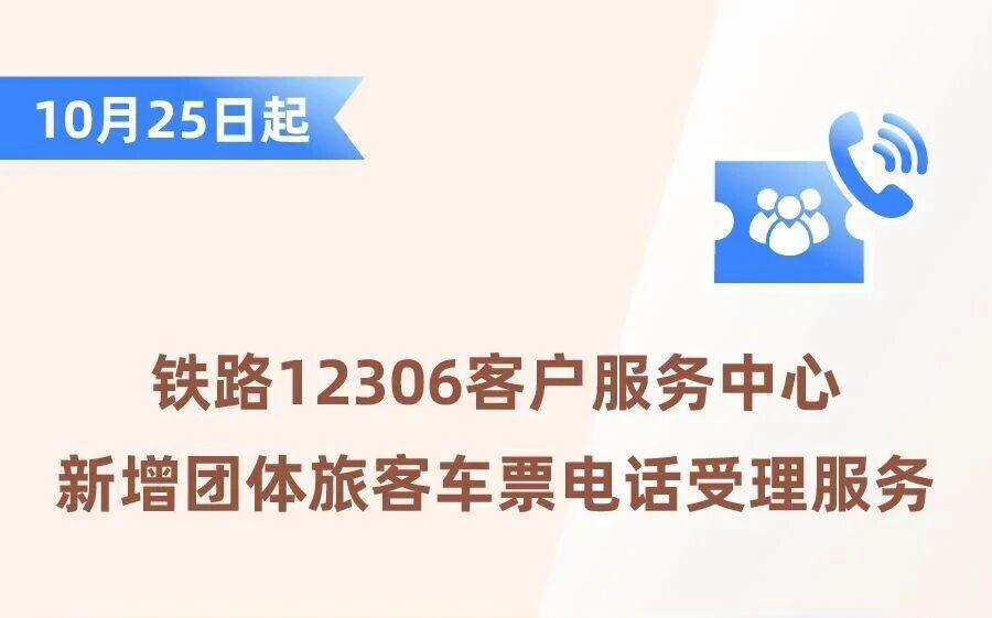 今天(25日)起,铁路12306客户服务中心新增团体旅客车票电话受理服务,铁路12306客户端(含网站)单笔购票数量上限调至19张,单个铁路12306账户可添加的“乘车人”数量由15人调至30人,同时,铁路各客运车站继续现场受理团体旅客购买火车票业务,各类旅游、研学、演出、赛事等团体旅客集中购票出行...