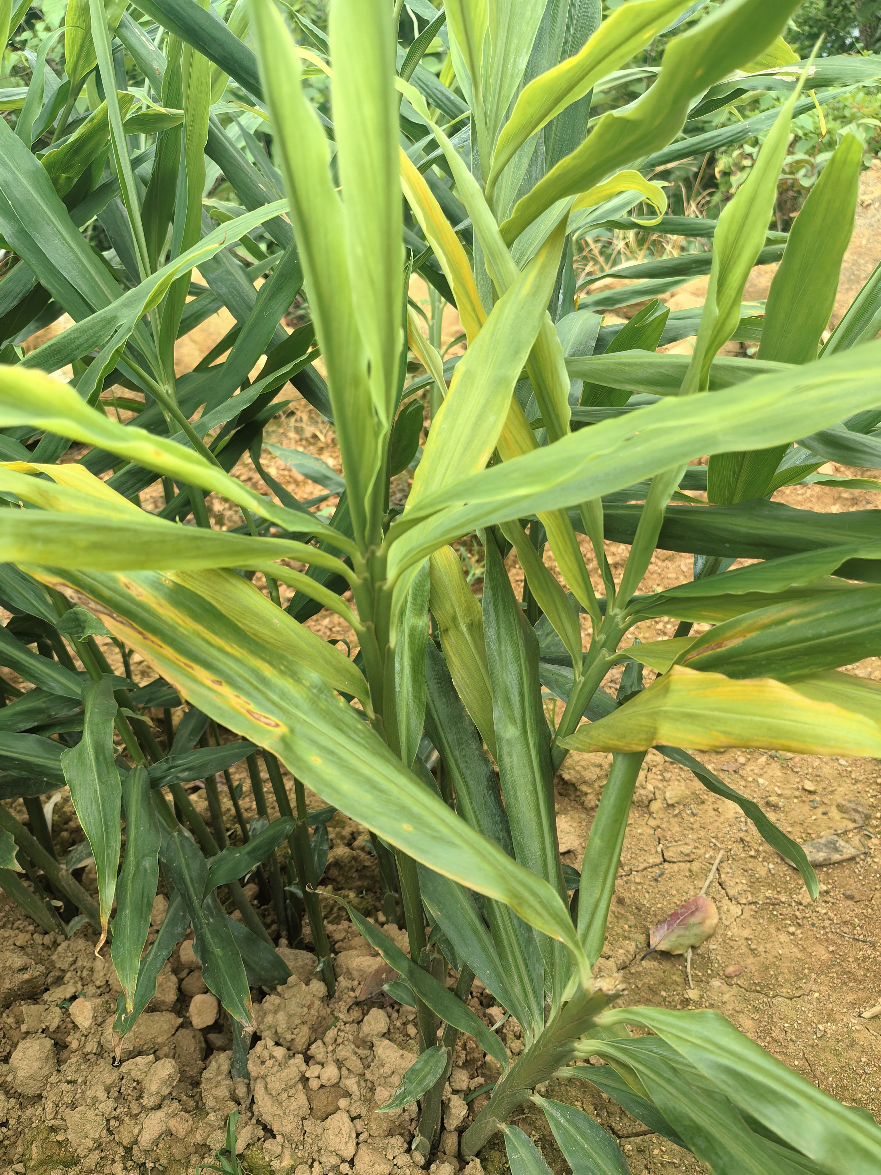 根据表现的症状,推测可能的原因(供参考): 1.真菌性叶枯病(黄叶病):初期从下部叶片发黄,逐渐向上蔓延,整株变黄,后期叶片干枯但不迅速传染。姜块一般无明显腐烂,区别于姜瘟病。 2.生理性黄化:缺氮、镁、铁等营养元素,或长期积水、根系呼吸受阻,也可能导致叶片黄化。 种植过程中推荐用药与防治措施(参考一下): 一、化学药剂(推荐轮换使用):1、苯醚甲环唑(10%)1500倍液叶面喷施,广谱抗真菌药,每5~7天一次,连喷2~3次; 2、多菌灵(50%)400~600倍液喷施,与苯醚甲环唑轮换使用效果更好; 3、百菌清à600~800倍液喷雾à预防性强,适合雨后或发病初期; 二、生物制剂(可选):枯草杆菌、哈茨木霉菌:300倍灌根或喷雾,抑制病菌、促根壮苗。 大蒜油1000倍+青枯立克90~150倍:连续喷施3次,间隔2~3天。 三、种植管理建议: - 轮作:避免连作,建议与玉米、豆类等作物轮作3年以上。 - 排水控湿:生姜怕涝,雨季及时排水,降低湿度。 - 施肥调整:补充氮、镁、钾,避免偏施氮肥,可喷含镁叶面肥缓解黄化。 - 清除病叶:及时剪除黄叶并带出田外烧毁,减少菌源。 四、综合的用药方案: - 第一步:剪除黄叶,清理田间残体。 - 第二步:喷施苯醚甲环唑1500倍 + 多菌灵500倍,5~7天一次,连喷2次。 - 第三步:若怀疑生理性黄化,可加入含镁叶面肥或微量元素肥喷施。 - 第四步:若病情反复,可改用枯草杆菌或哈茨木霉菌灌根调理土壤。 如姜块开始腐烂、有臭味或整株迅速萎蔫,则需考虑姜瘟病(青枯病),此时应立即拔除病株并用中生菌素、噻菌铜等铜制剂灌根处理。 化学药剂防治时,注意轮换用药以延缓抗药性产生。喷药时务必均匀周到,叶片正反面都要喷到。雨后酌情补喷。
