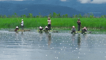 七月,云南省大理白族自治州洱源县300多亩深水海菜花迎来丰收季,工人们正划船采收,这标志着当地实现海菜花深水种植。