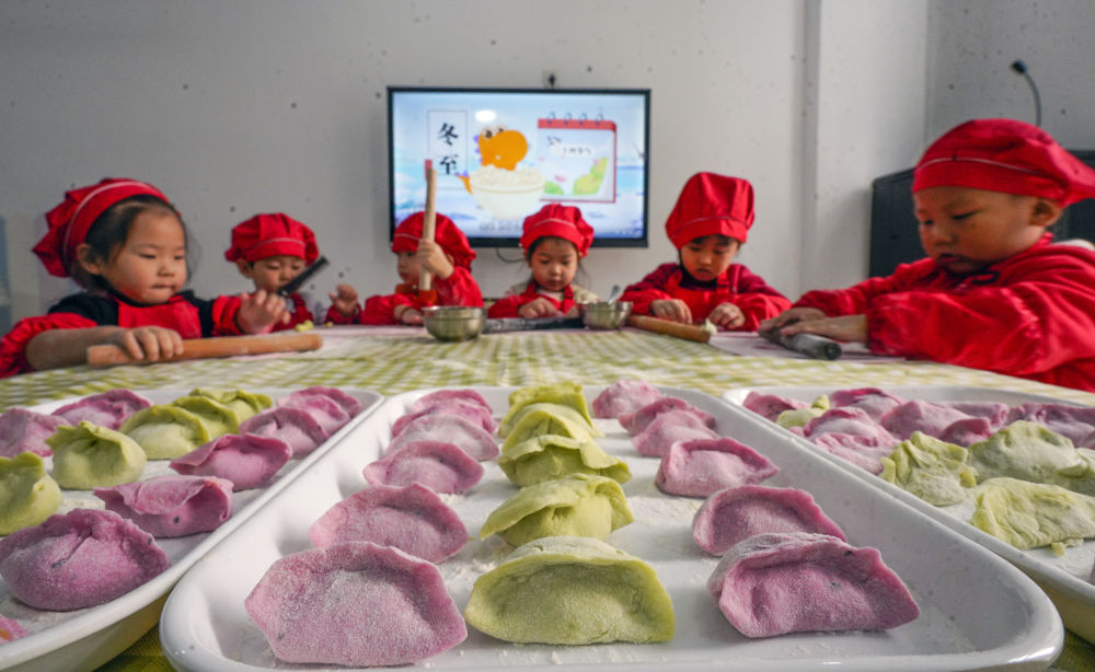 2021年12月21日,冬至,江苏省扬州市一家幼儿园的小朋友展示包好的饺子。新华社发(孟德龙 摄)