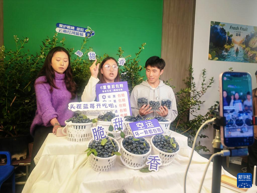 在云南省红河州建水古城,几名年轻人正在通过直播销售蓝莓。新华社记者 浦超 摄