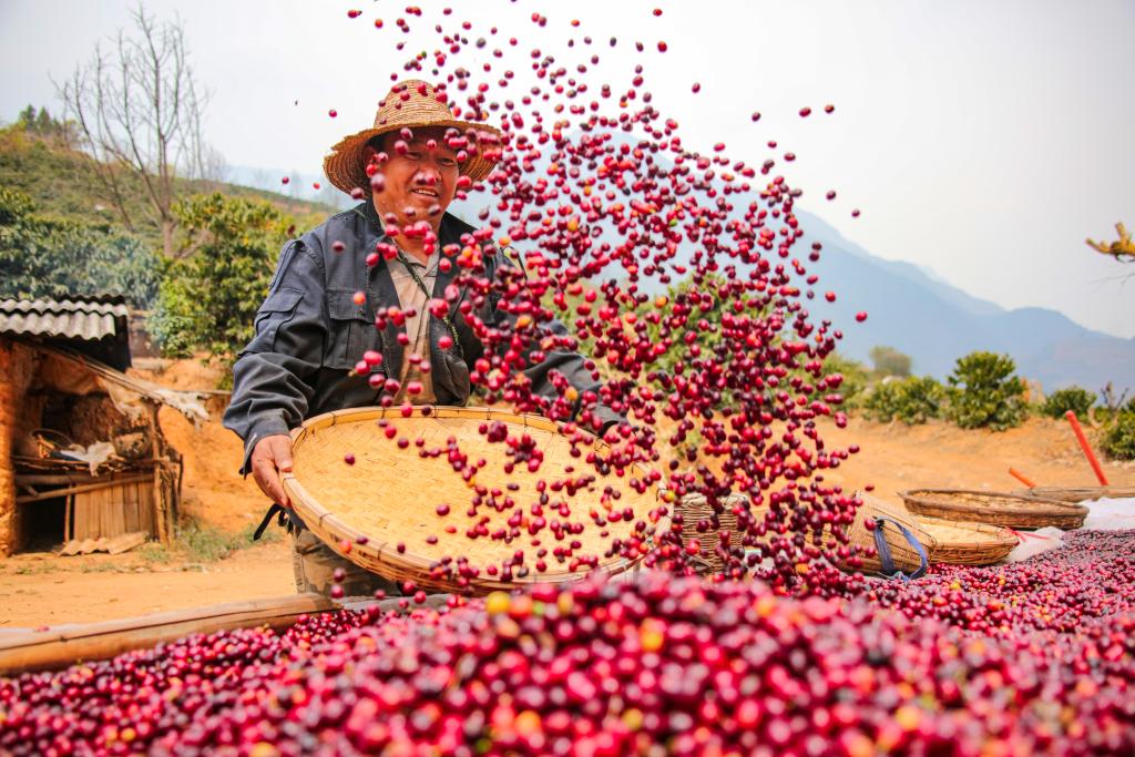 这是云南保山的咖农在晾晒咖啡豆。(昆明海关供图)