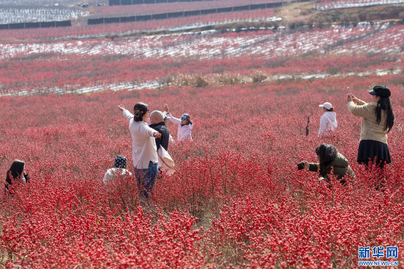 在北美冬青的“红色海洋”中,游客正在拍照打卡(1月4日摄)。新华网发(杨俊鹏 摄)
