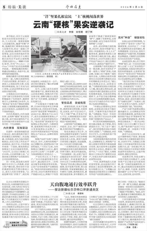 核桃的醇香与坚果的酥脆交织在一起,勾勒出高原特色产业的兴旺图景。春节前夕,记者深入云南临沧和大理,实地探访种植基地、加工车间与出口货场,记录这两种果实从田间到市场的历程。