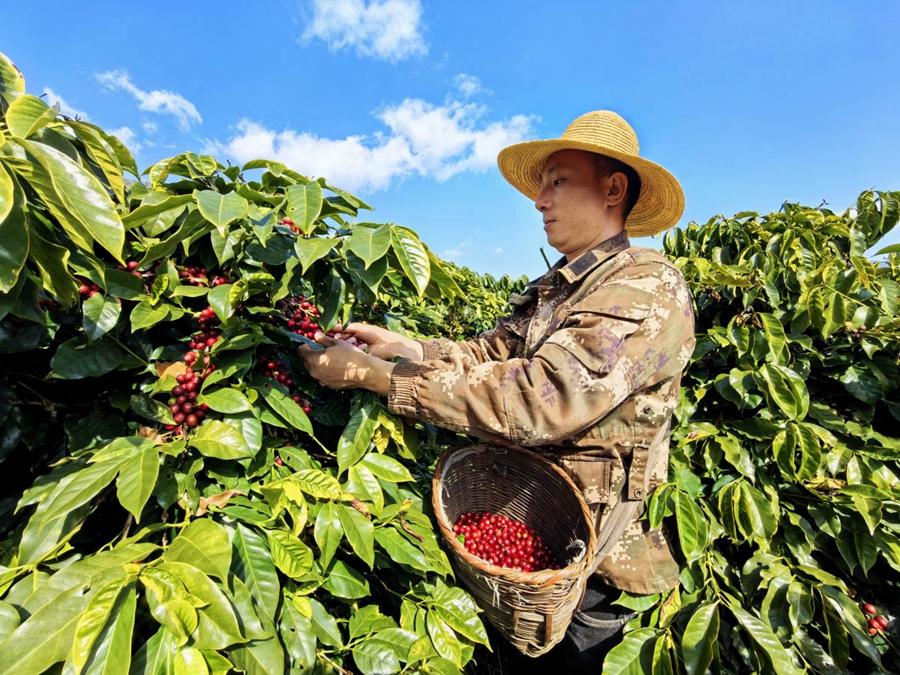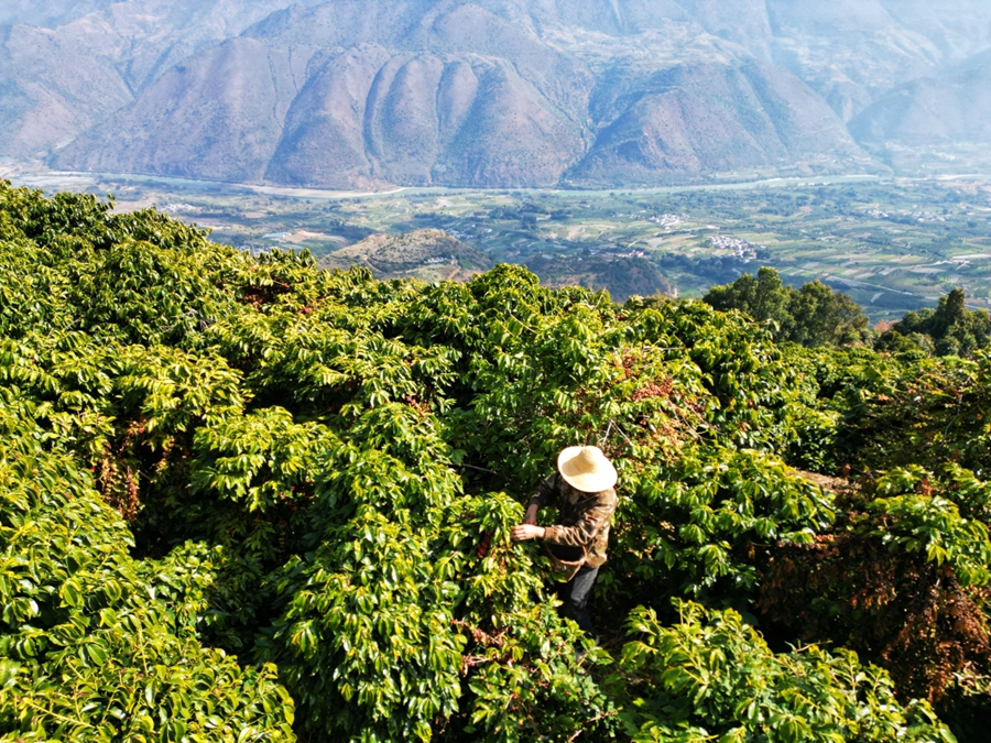 咖农王剑在采摘咖啡豆(摄于1月15日)。新华网 赵普凡 摄
