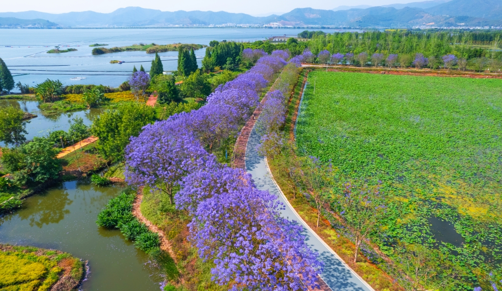 四月的云南省红河哈尼族彝族自治州石屏县异龙湖畔,蓝花楹悄然盛放。环湖赛道被染上一层梦幻的蓝紫色,一串串风铃般的花朵挂满枝头,在微风中轻轻摇曳。市民骑行或漫步于花下,与盛放的蓝花楹、静谧的湖畔相映,构成一幅绝美的春日画卷。(石屏县融媒体中心 杨灿 冯宇)