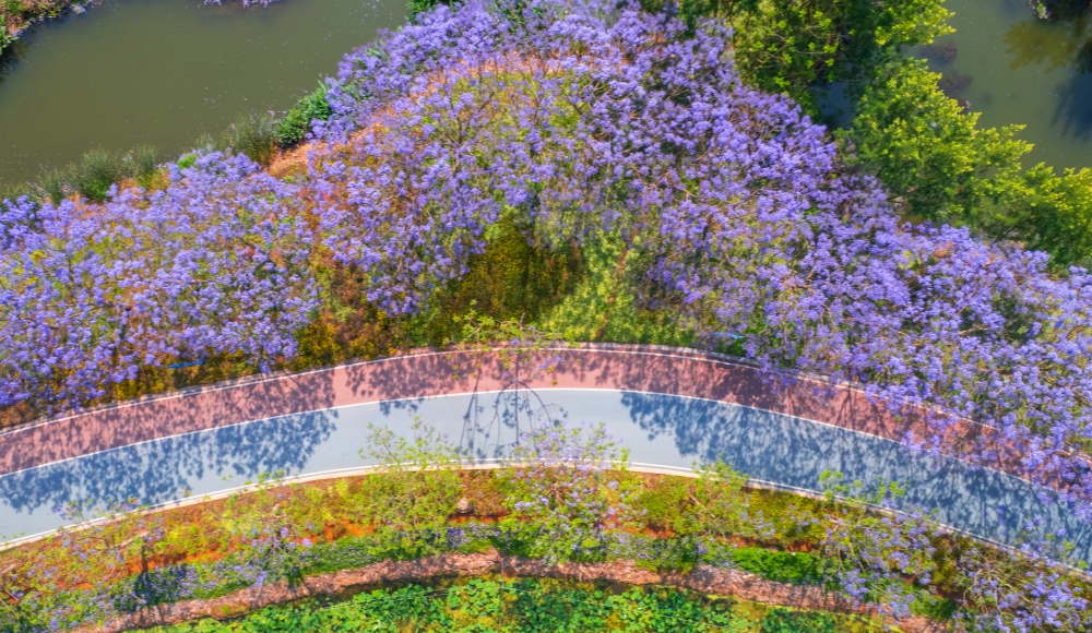 航拍蓝花楹步道(4月7日摄)。新华网发(石屏县融媒体中心供图)