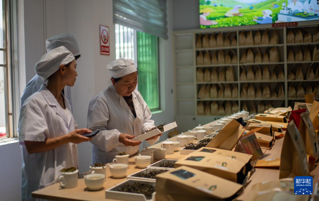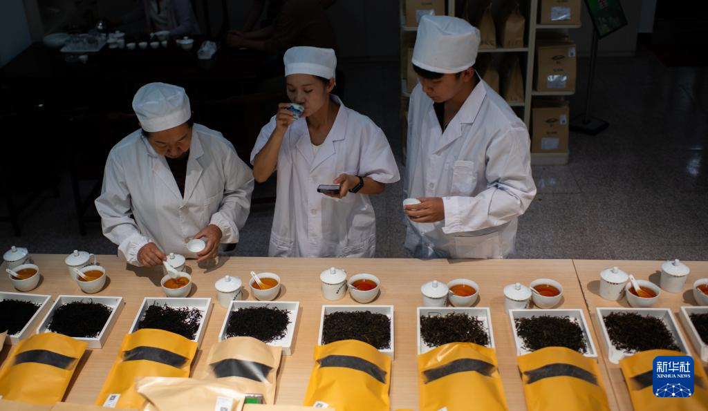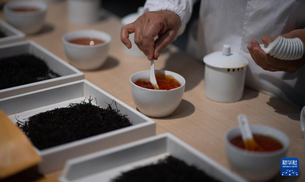 4月22日,云南省临沧市双江县茶叶检测品荐溯源中心的专家在评审茶叶。新华社记者 江文耀 摄